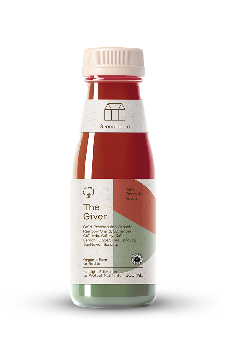 Rainbow Chard, Cucumber, Collards, Celery, Kale, Lemon, Ginger, Pea Sprouts, Sunflower Sprouts (All Organic + Cold-Pressed)